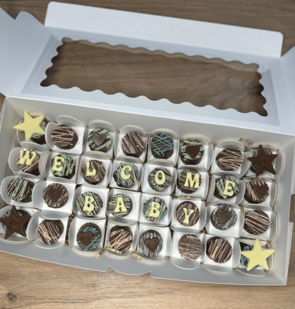 طريقة حلوة للترحيب بالمولود الجديد مع 32 قطعة شوكولاتة للاحتفال بالقدوم الجديد.