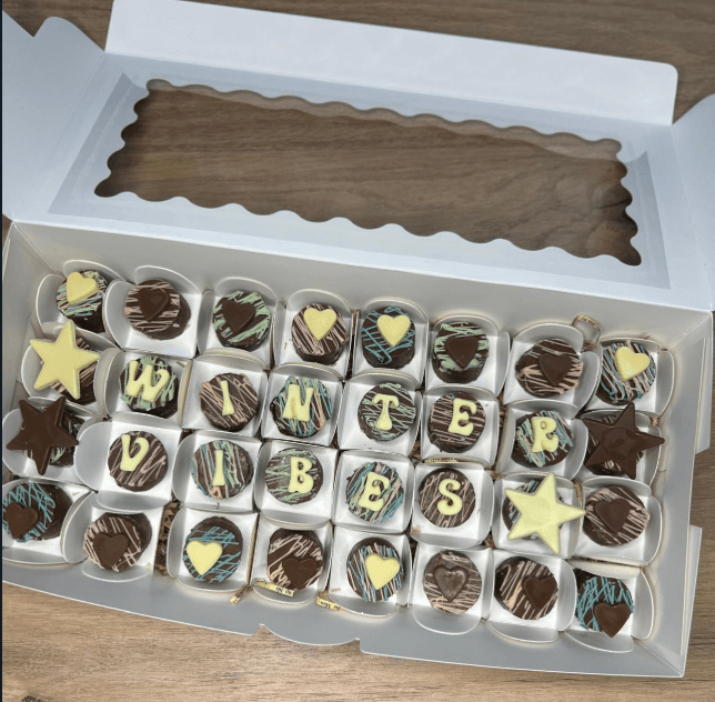 علبة مليئة بـ 32 قطعة من الشوكولاتة المصنوعة يدويًا للاستمتاع بأجواء الشتاء والدفء.